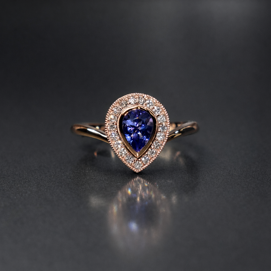 Pear shaped tanzanite and diamond halo, set in rose gold
