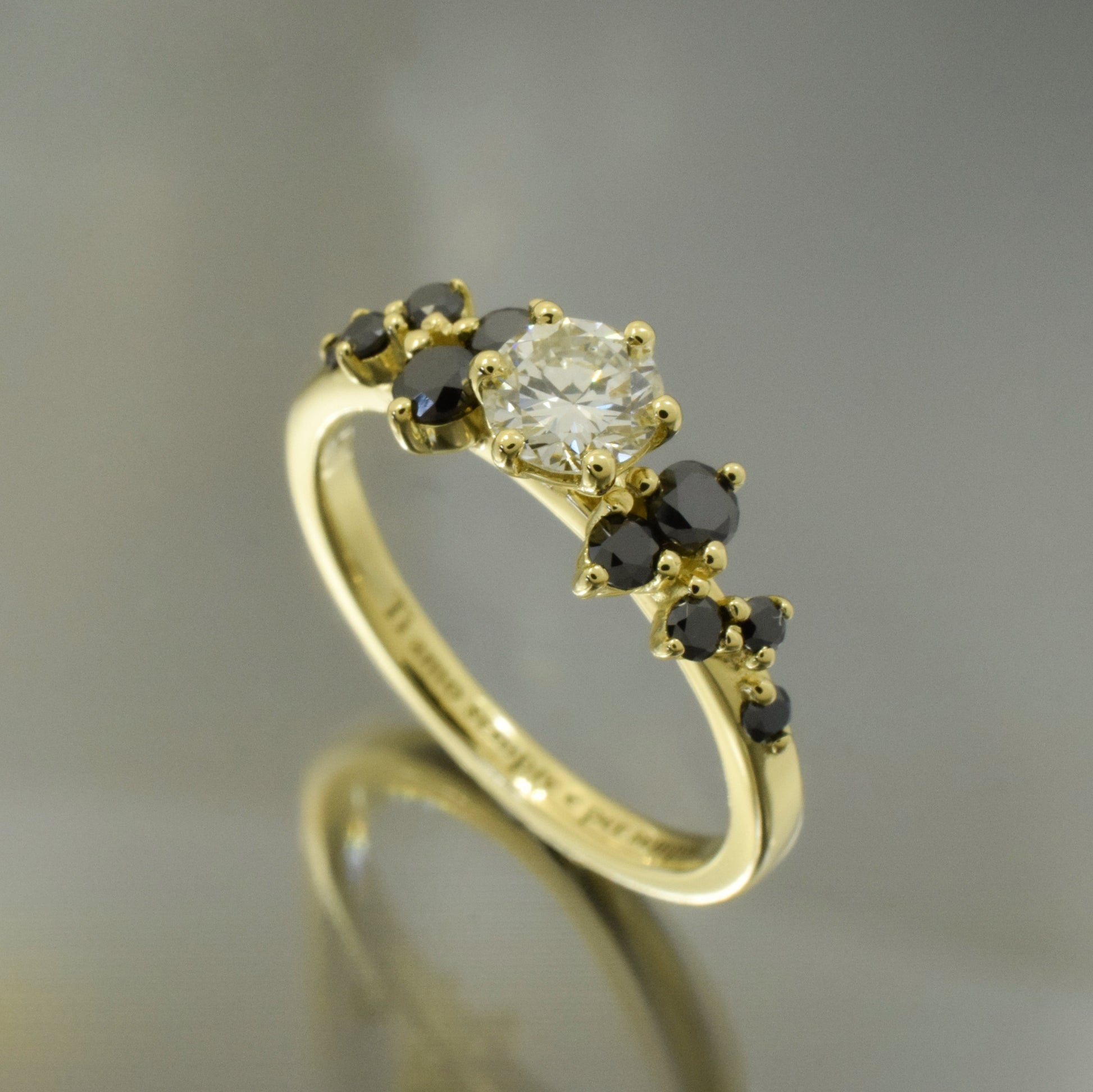 White and black diamonds randomly set on a delicate organic, yellow gold band.