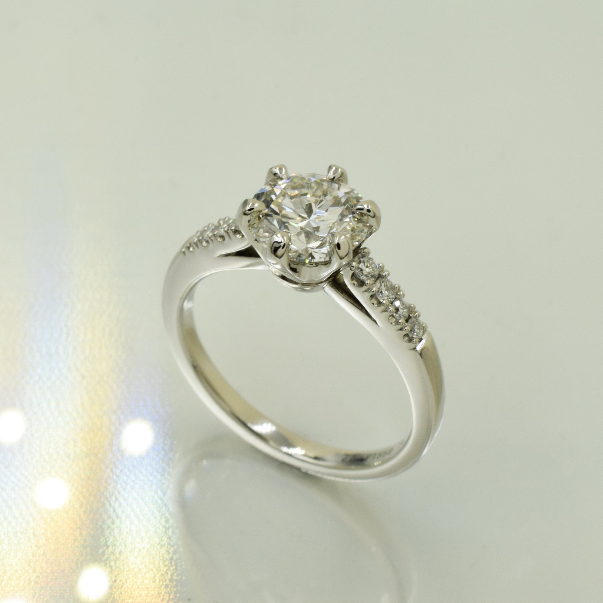 Six claw crown solitaire with tapering accent diamonds, set in platinum.
