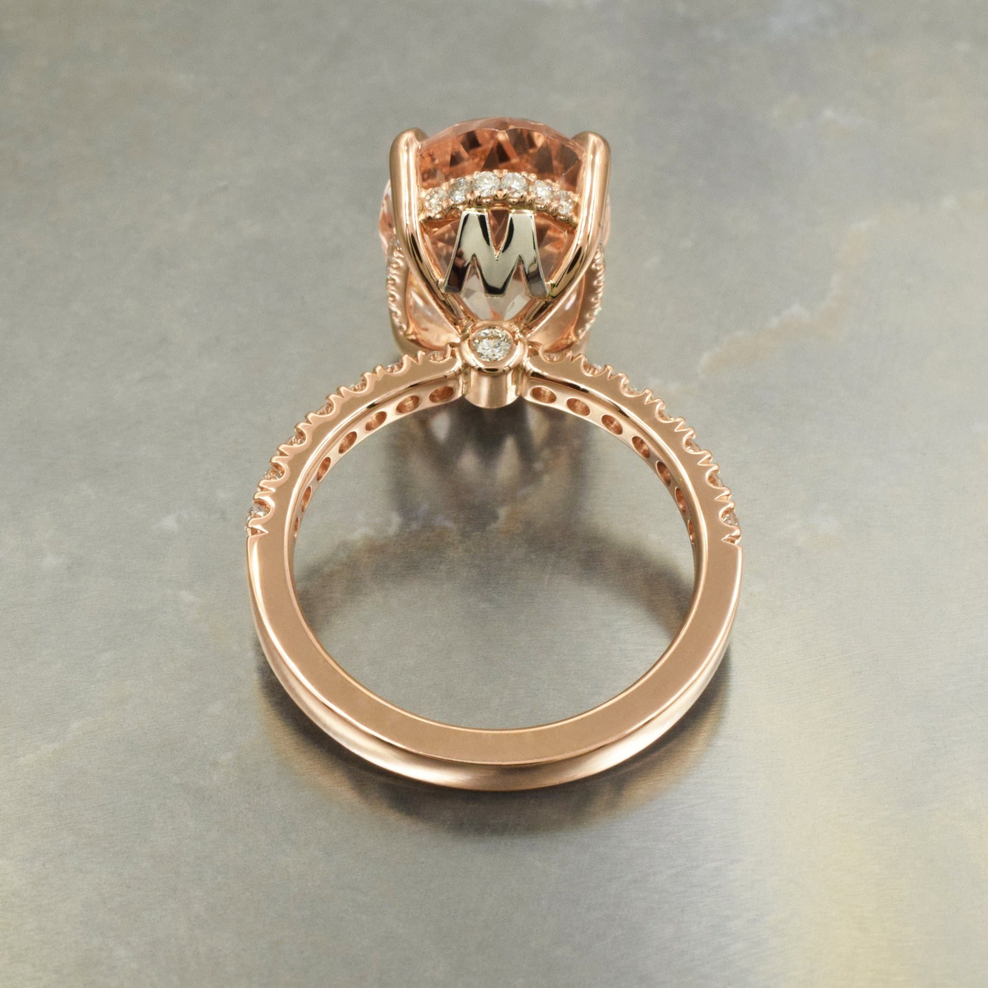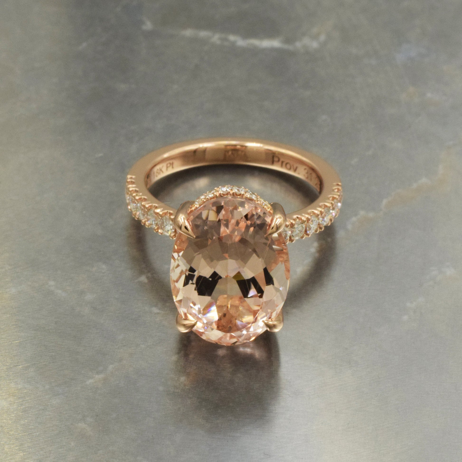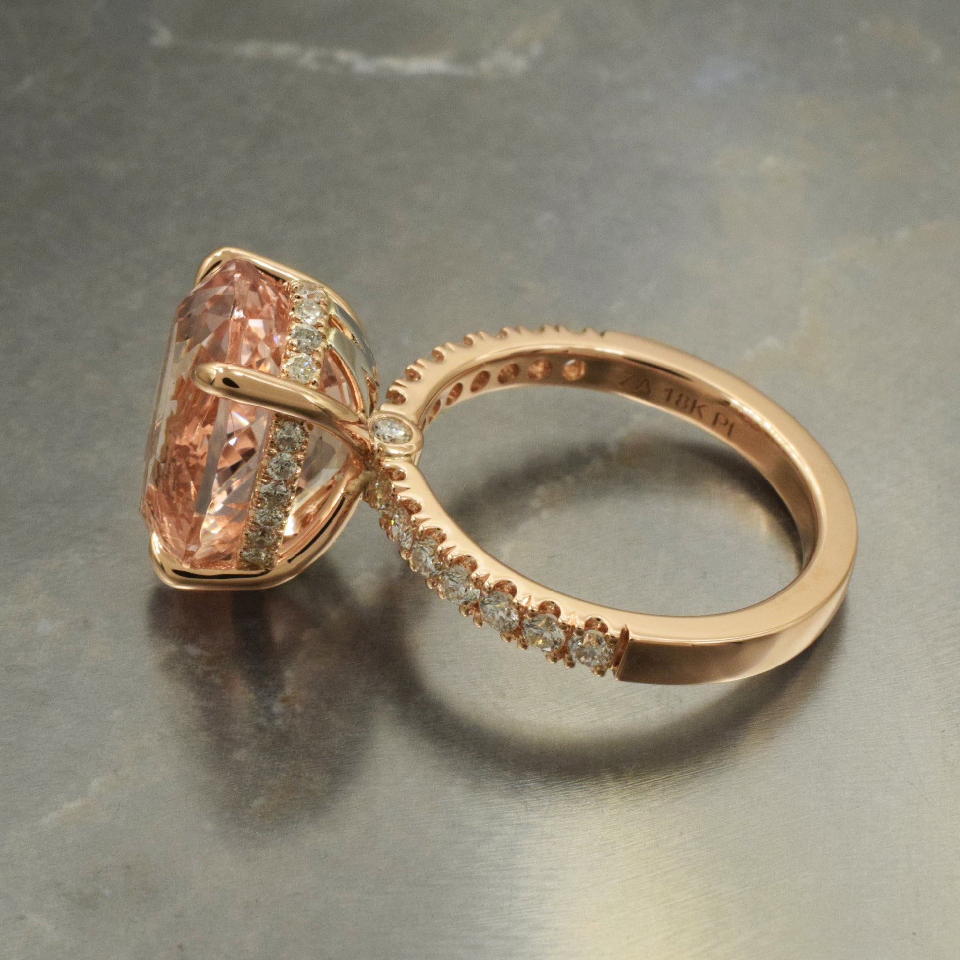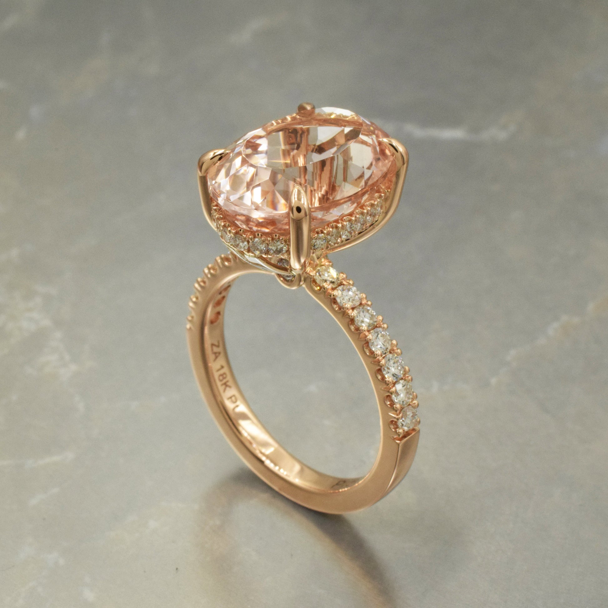 Handmade rose gold and platinum solitaire with a hidden halo. Set with a very large natural oval morganite and diamonds.