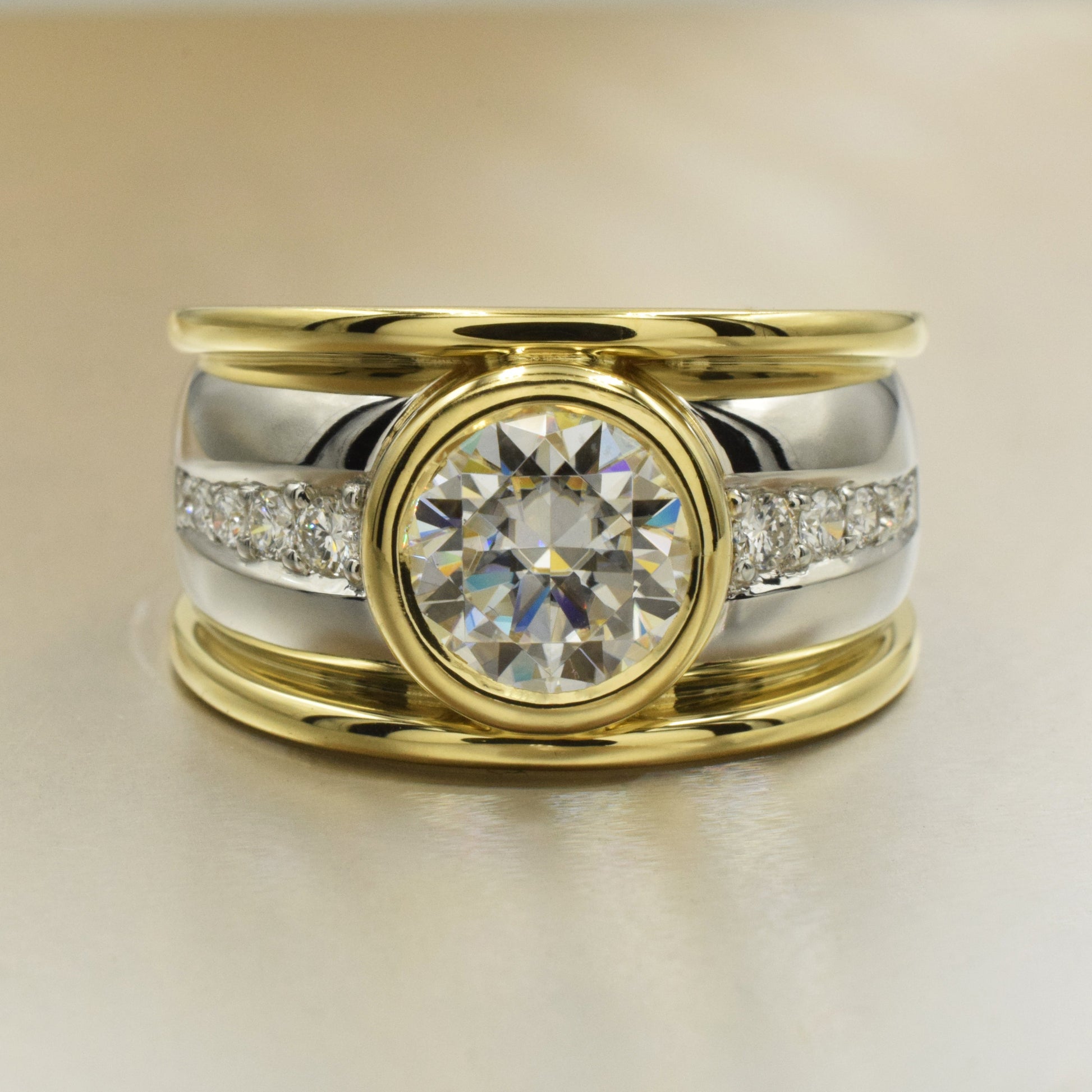18K yellow gold and platinum ring set with pave diamonds and moissanite.