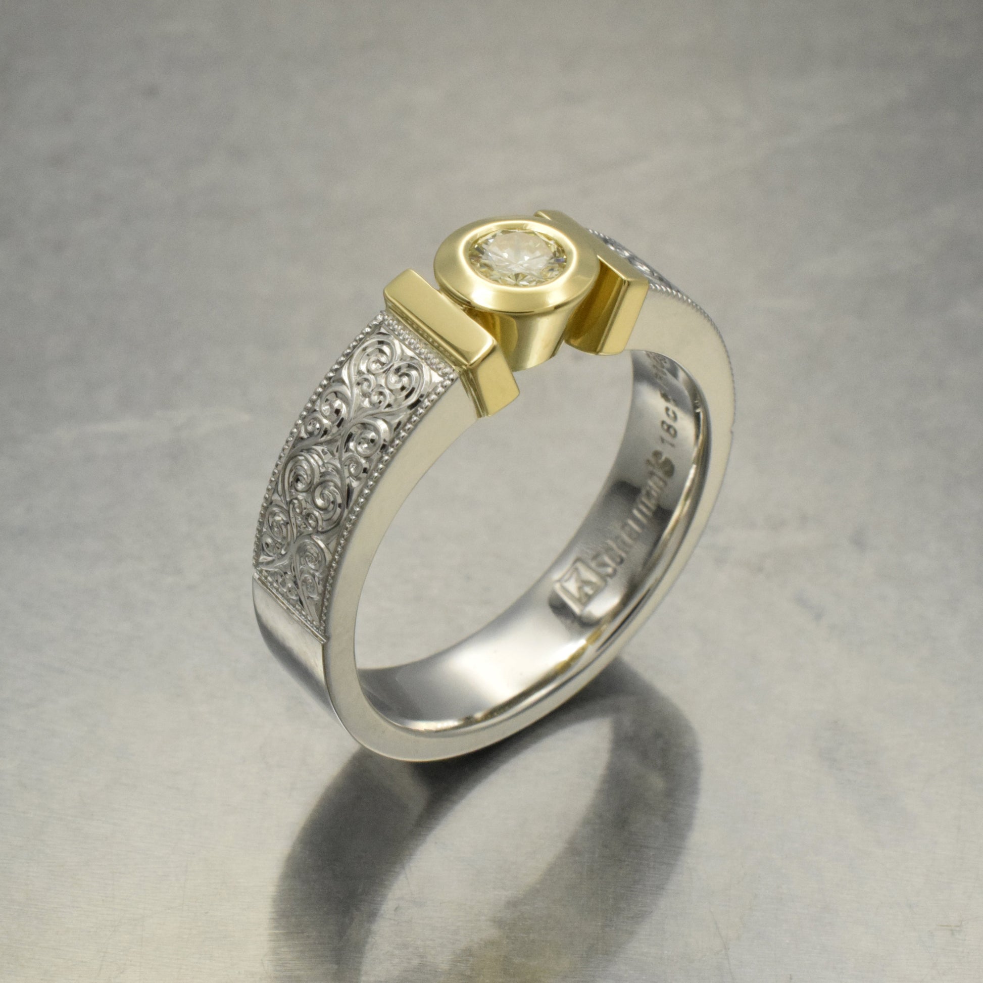 Platinum and yellow gold bar solitaire with bezel set diamond