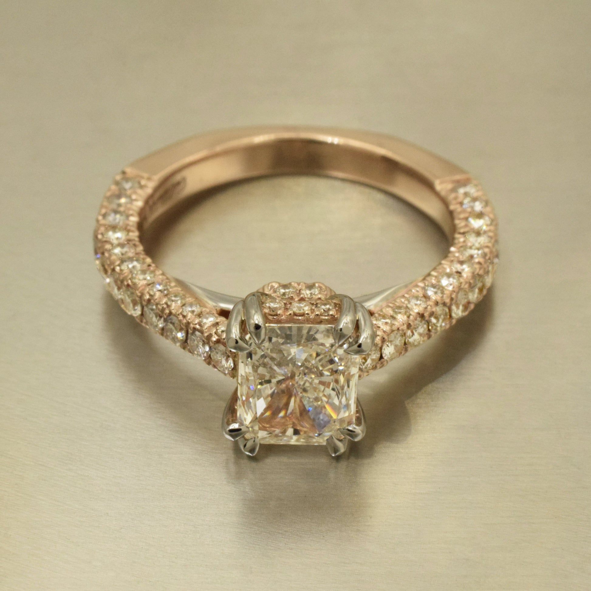 Rose gold and diamond encrusted solitaire set with a Radiant cut diamond