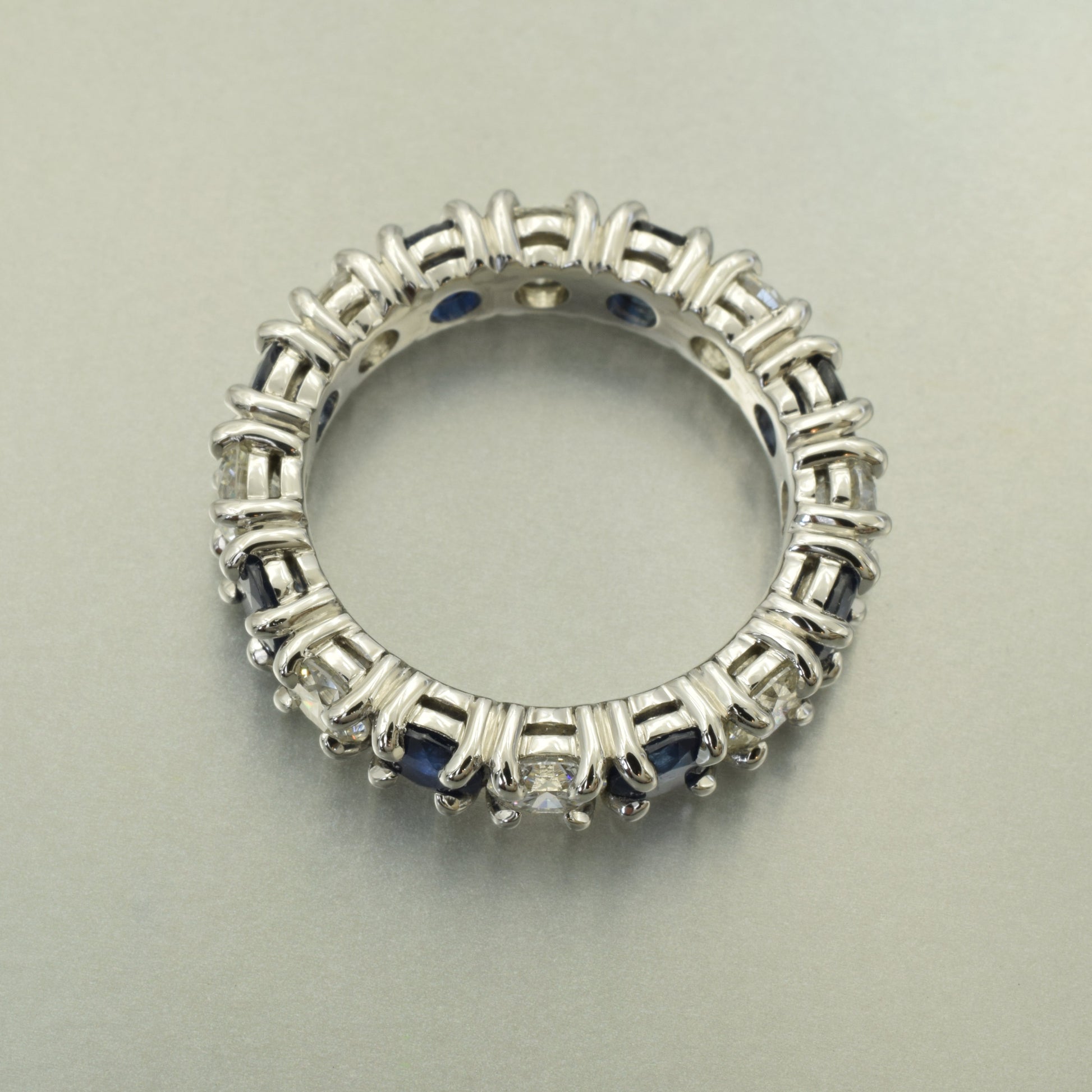 Handmade platinum full eternity ring set with natural diamonds and sapphires.