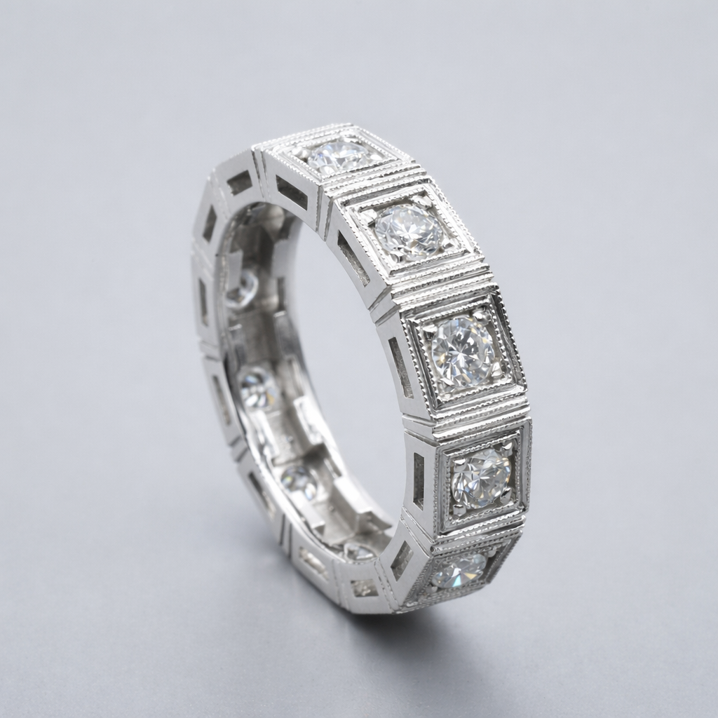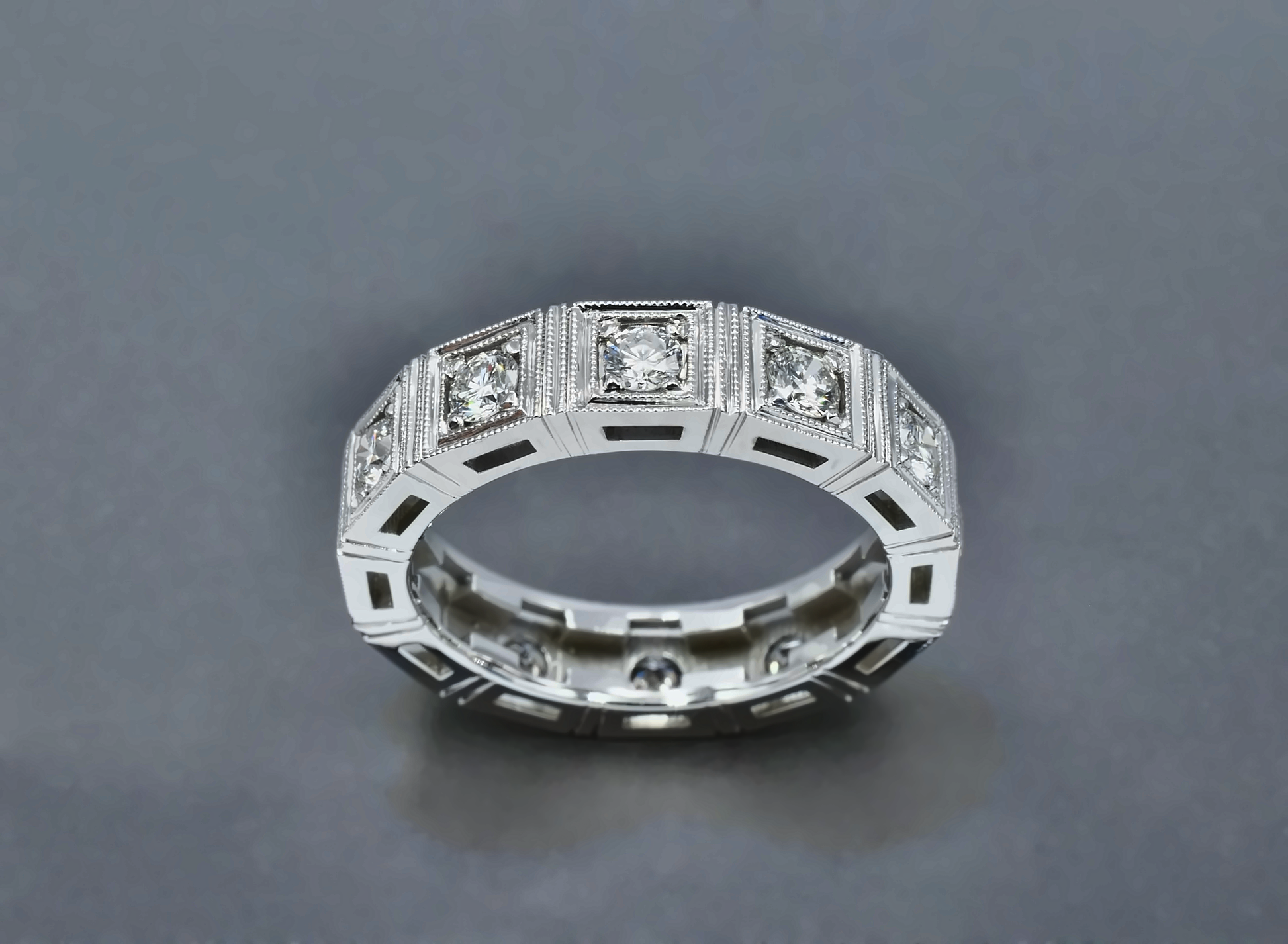 Sectionally constructed full eternity band set with diamonds.