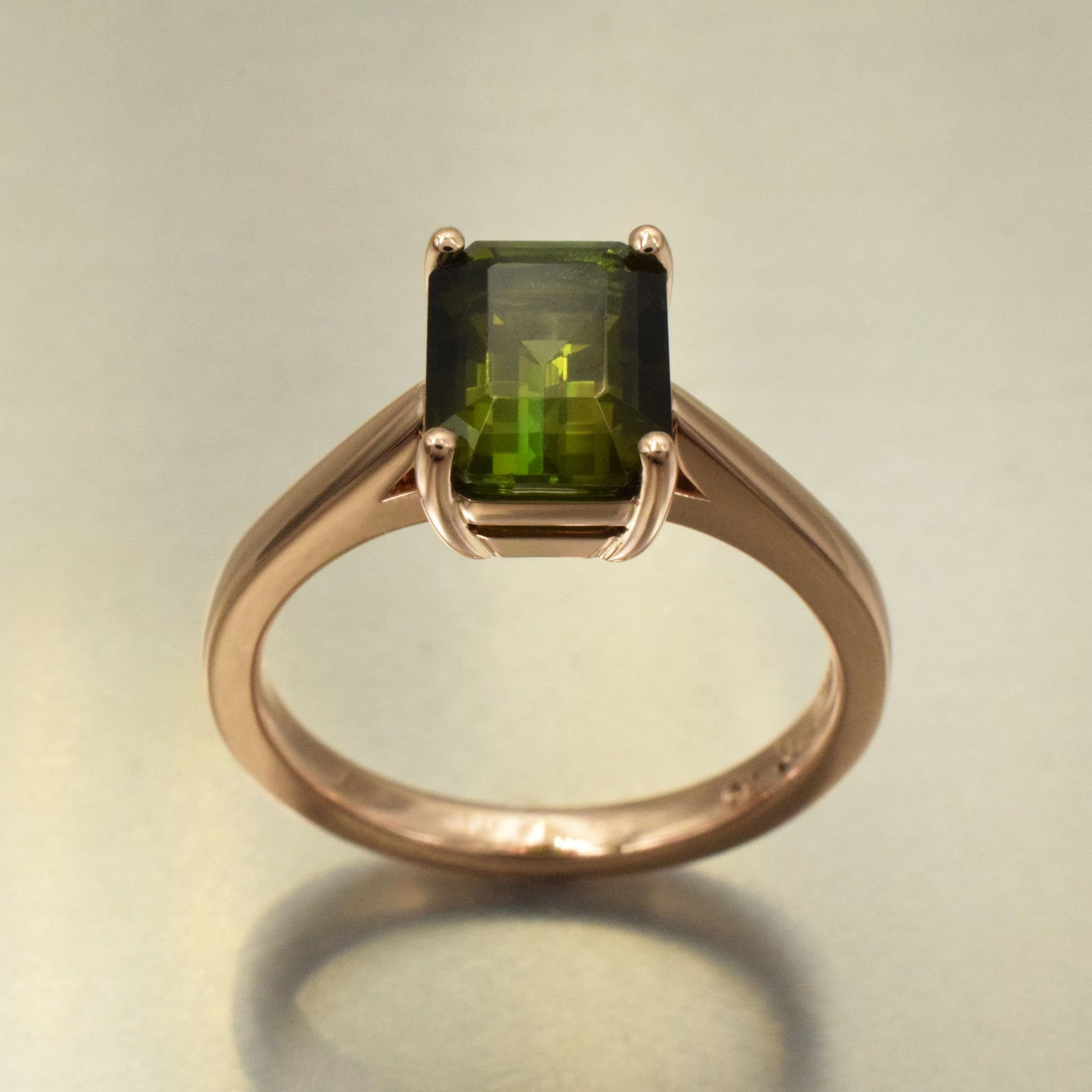 Four claw rose gold solitaire, set with an emerald cut tourmaline.