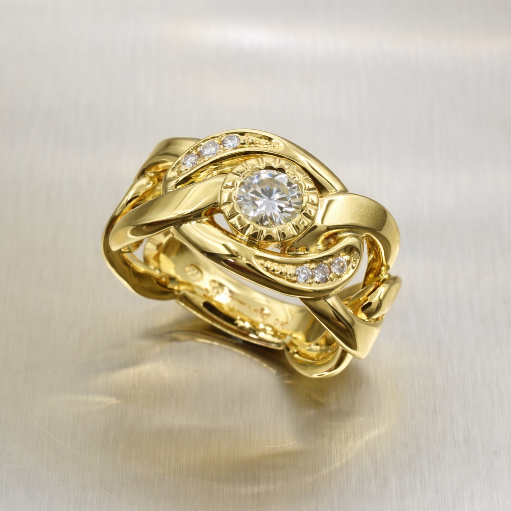 Handmade Cuban-link dress ring, pave set with diamonds.