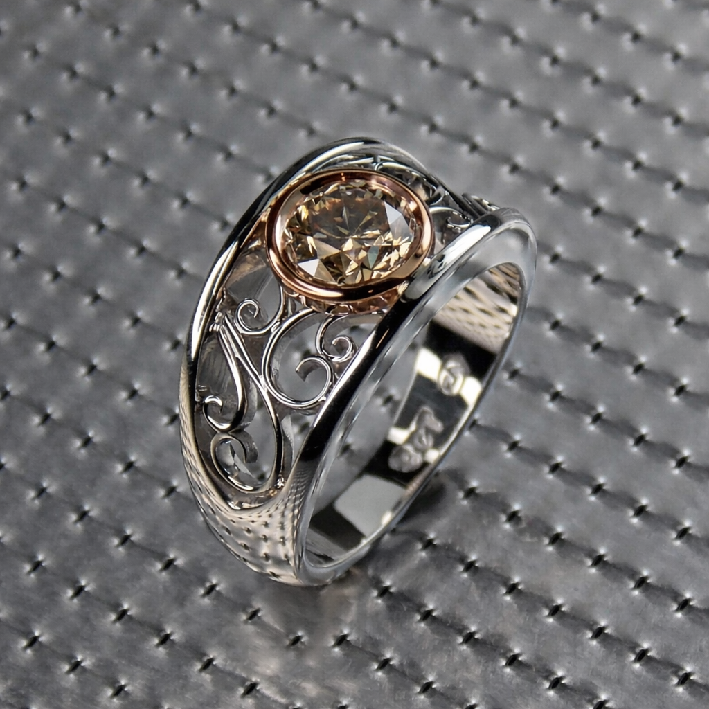 9ct white & rose gold filigree ring set with champagne colored diamond