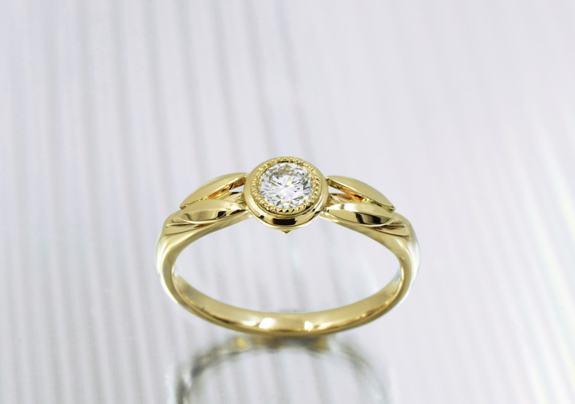 Laurel wreath inspired solitaire. Diamond bezel set in yellow gold.